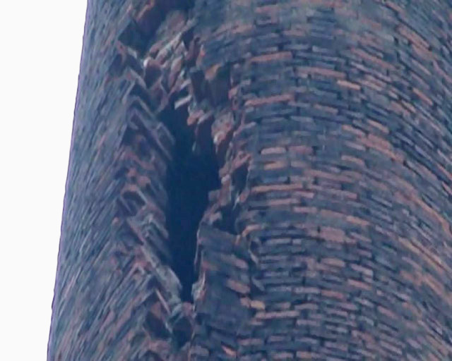 該煙囪位于富陽市新登鎮(zhèn)銀泰機(jī)械鑄造廠區(qū)內(nèi),系原磚瓦廠取締后遺留,一直未妥善處理。今年3月初因遭雷擊后煙囪出現(xiàn)了巨大的縱向裂縫,隨時有倒塌危險。該煙囪距北側(cè)廠房僅0.2米,距東側(cè)廠房約8米,給鑄造廠安全生產(chǎn)帶來極大安全隱患,3月9日廠區(qū)因此全面停產(chǎn)。