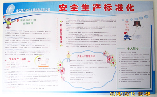 2014年12月18日,由省國防科工辦組織由省民爆行業(yè)專家對浙江物產(chǎn)京安工程科技有限公司安全生產(chǎn)標(biāo)準(zhǔn)化組織評審工作順利結(jié)束,評審組得出如下總體考評結(jié)論和等級推薦意見:京安公司安全標(biāo)準(zhǔn)化總得分為928.79分(位列全省生產(chǎn)企業(yè)第二名),甲類項合格率為93.8%,同意推薦為浙江省民爆器材生產(chǎn)企業(yè)的安全生產(chǎn)標(biāo)準(zhǔn)化A級達(dá)標(biāo)企業(yè)。